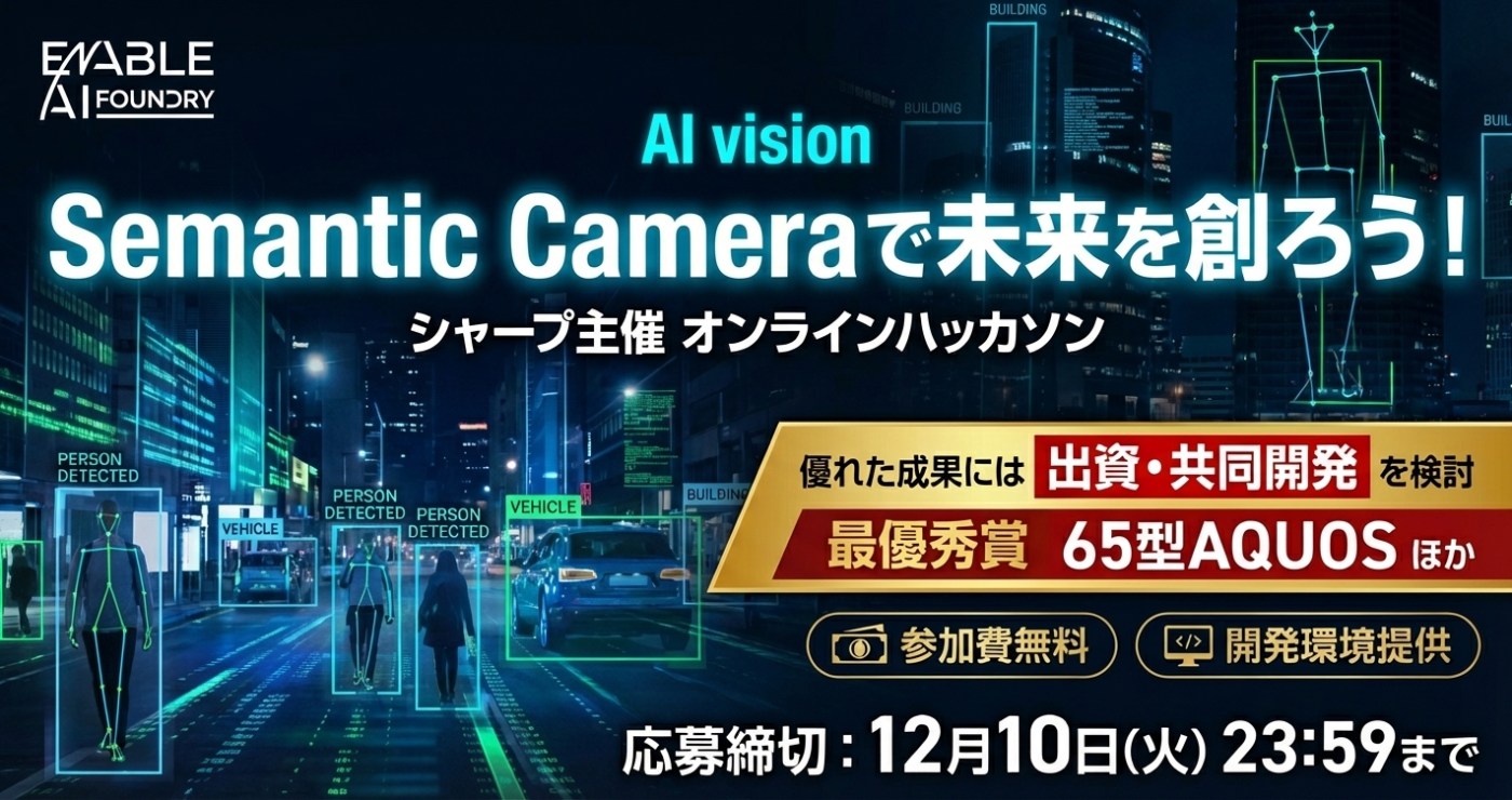 シャープは12月22日から2026年1月5日まで、オンラインハッカソン「Semantic Camera で未来を創ろう!」を開催する。参加費は無料。優れた成果を残したチームには賞品授与に加え、出資や共同開発、アクセラレーション支援も検討する。